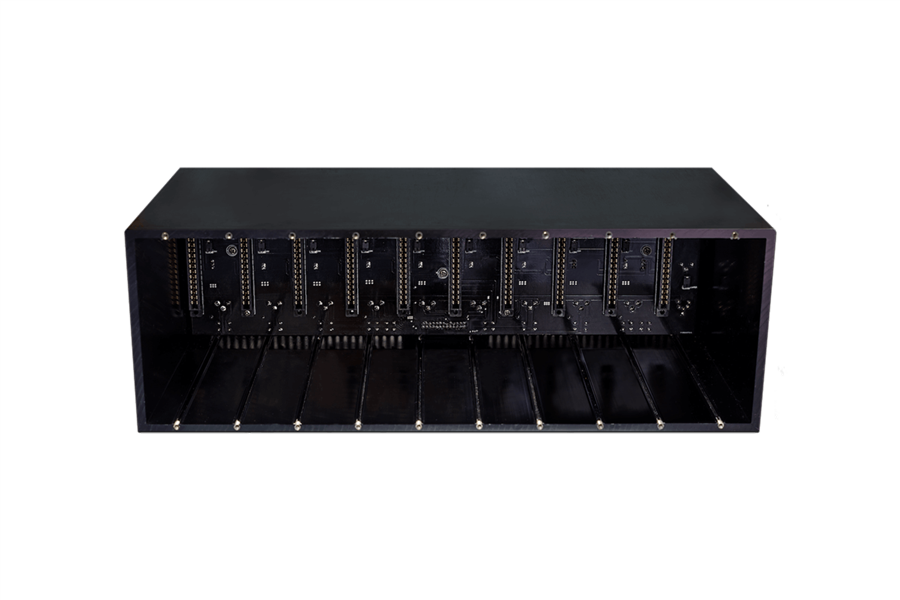 Bytelný rack pro moduly systému 500 s vlastním napájením, 10 modulů, filtrované napájení s ochranou proti přepětí a zkratu, Feed přepínače pro propojení slotů, vstupy a výstupy na XLR i D-Sub konektorech