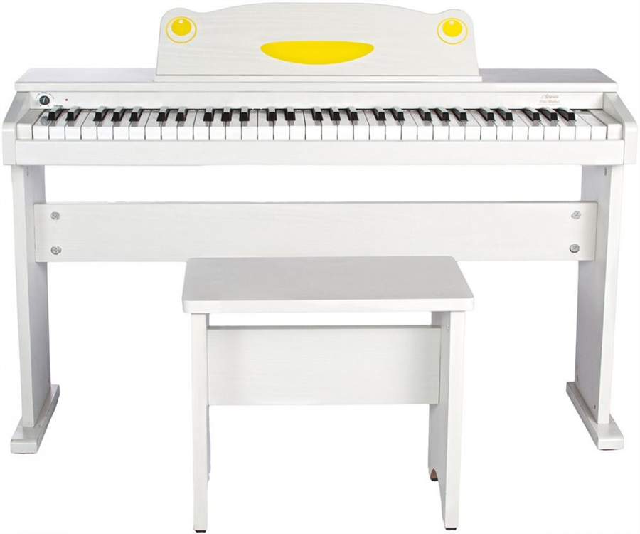 Stylový dětský klavír s odlehčenou dynamickou klaviaturou 61 kláves a zabudovaným ozvučením. Klavírní stolička, sluchátka, sustain pedál, síťový napájecí adaptér, stojan a USB kabel jsou součástí. Povrchová úprava bílá.