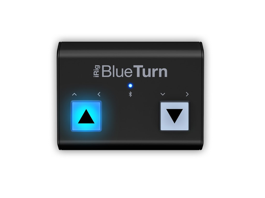 Bluetooth obracení stránek. Mnoho hudebníků v dnešní době využívá tablet nebo podobné zařízení pro zobrazování hudebních podkladů, ať už se jedná o prostý text nebo partituru. Jak ale jednoduše a přesně otáčet při hře stránky? K tomu slouží právě iRig Blue Turn - pedál, který se připojuje přes Bluetooth a díky dvěma podsvětleným tlačítkům umožňuje snadné otáčení stránek nebo posouvání textu bez použití rukou.