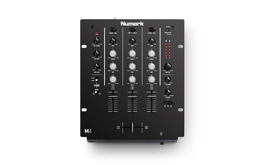 Numark M4 je 3-kanálový DJ mixpult. Každý kanál disponuje třípasmovým EQ. Připojit lze dva gramofony a až 4 linkové vstupy, případně kombinovat (přepínač phono/line). Nechybí mikrofonní vstup a sluchátkový výstup.