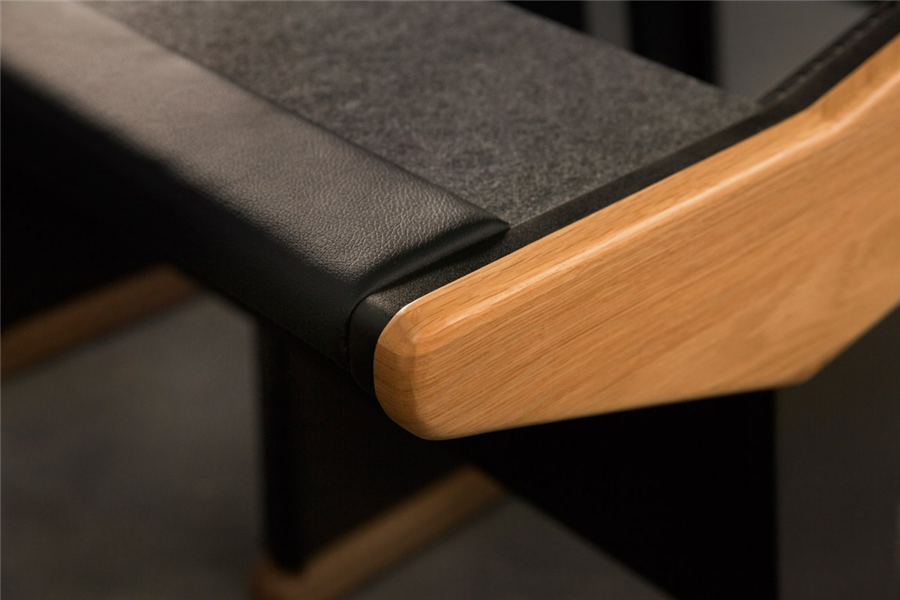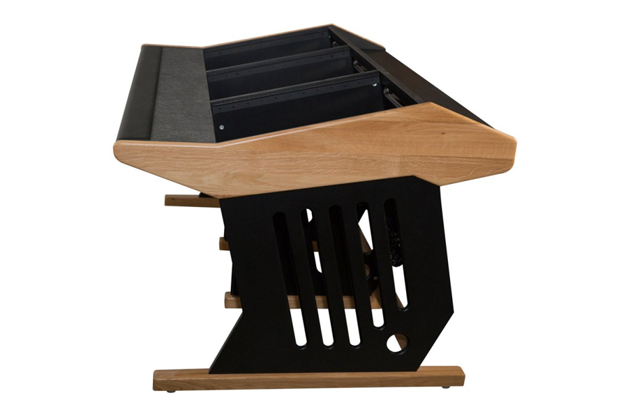 Nízký profil stolu je konstruovaný tak, aby co nejméně ovlivňoval reprodukci zvuku. Tomu napomáhají VMT absorbční panely Vicoustic, které minimalizují chaotické odrazy, integrované v jeho zadní části. Pracovní plocha je vyrobena z Aerstopu, akustického materiálu, který taktéž minimalizuje zvukové odrazy a zároveň plní funkci podložky pod myš. Malá loketní opěrka zaručuje plynulé psaní a zároveň šetří vaše zápěstí. Celý stůl je konstruován v designu „více vzduchu nežli hmoty“, což jednak napomáhá volnému proudění vzduchu uvnitř jeho prostoru a zároveň se tím omezuje vznik stojatých vln. Duální kabelová trasa odděluje signálovou část od napájecích kabelů, a minimalizuje tak brum a indukční šum. Chromové tyče s připravenými Velcro pásky na suchý zip umožňují rychlé a čisté svazkování kabeláže. 54 rackových jednotek 19“ - všechny důležité nástroje máte v dosahu a na minimálním půdorysu. To umožňuje perfektní workflow. Méně používaná 19“ zařízení lze jednoduše umístit pod stůl, kde se nachází 18 U rackového prostoru. V zadní části stolu je zapuštěná snížená police pro umístění meter bridge, obrazovek nebo reproboxů na volitelných izolátorech, které zabraňují přenosu zvuku přes stůl, a tím eliminují rozmazání akustického přednesu v nižších frekvencích. Nic zde není navíc a nic zde nechybí. Maestro - souznění ergonomie, akustiky a designu.