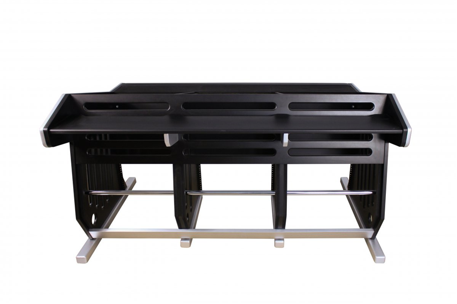Nízký profil stolu je konstruovaný tak, aby co nejméně ovlivňoval reprodukci zvuku. Tomu napomáhají VMT absorbční panely Vicoustic, které minimalizují chaotické odrazy, integrované v jeho zadní části. Pracovní plocha je vyrobena z Aerstopu, akustického materiálu, který taktéž minimalizuje zvukové odrazy a zároveň plní funkci podložky pod myš. Malá loketní opěrka zaručuje plynulé psaní a zároveň šetří vaše zápěstí. Celý stůl je konstruován v designu „více vzduchu nežli hmoty“, což jednak napomáhá volnému proudění vzduchu uvnitř jeho prostoru a zároveň se tím omezuje vznik stojatých vln. Duální kabelová trasa odděluje signálovou část od napájecích kabelů, a minimalizuje tak brum a indukční šum. Chromové tyče s připravenými Velcro pásky na suchý zip umožňují rychlé a čisté svazkování kabeláže. 54 rackových jednotek 19“ - všechny důležité nástroje máte v dosahu a na minimálním půdorysu. To umožňuje perfektní workflow. Méně používaná 19“ zařízení lze jednoduše umístit pod stůl, kde se nachází 18 U rackového prostoru. V zadní části stolu je zapuštěná snížená police pro umístění meter bridge, obrazovek nebo reproboxů na volitelných izolátorech, které zabraňují přenosu zvuku přes stůl, a tím eliminují rozmazání akustického přednesu v nižších frekvencích. Nic zde není navíc a nic zde nechybí. Maestro - souznění ergonomie, akustiky a designu.