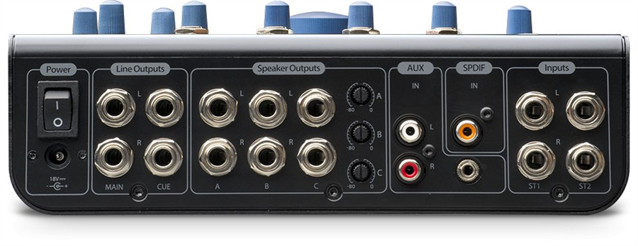 - 3 stereo páry TRS jack výstupů pro poslechové monitory s ovládáním hlasitosti