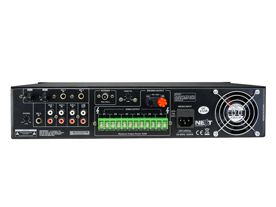 je 6 zónový směšovací zesilovač, 350 W [100 V | 8 Ω] pro středně velké a velké instalace. MX 350 můžete provozovat pro zátěž 4 – 16 Ω nebo 70 V / 100 V. Umí ovládat až 6 zón zcela nezávisle s celkovým výkonem až 350 W. S integrovaným přehrávačem je možné vložit USB flash disk nebo SD kartu a přehrávat zvukové soubory přímo na zařízení. Vstup MIC umožňuje připojení mikrofonu přes TS 6,3 (velký jack).