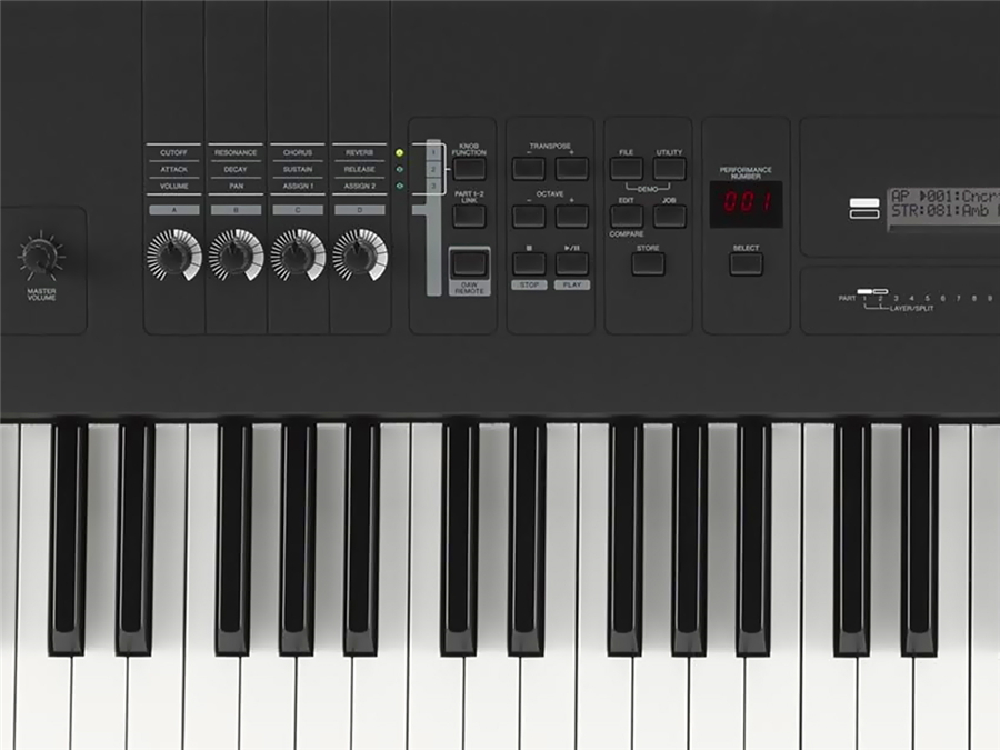Každá Performance neobsahuje pouze tři výše popsané zvuky, ale všechna nastavení pro kompletní 16 partový Multitimbrál. Můžete přepínat mezi kterýmkoli ze 16 Partů bez přerušení znění zvuku. Se 128 hlasy polyfonie máte obrovskou rezervu a potenciál pro přehrání i těch nejhustších sekvencí z vašeho DAW. Tyto vlastnosti dělají z MX88 perfektní řešení tónového generátoru pro živé hraní a živé přehrávání MIDI stop z vaší DAW.