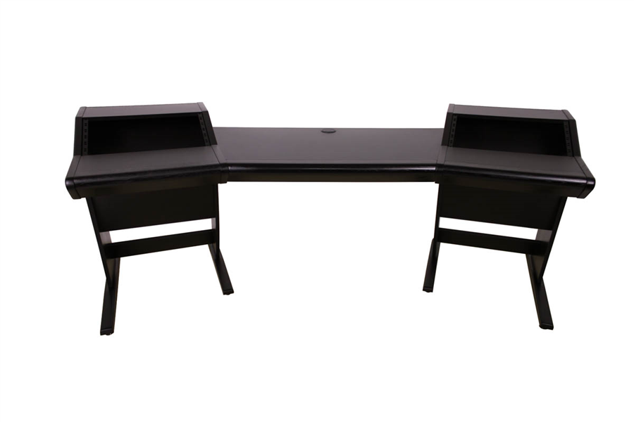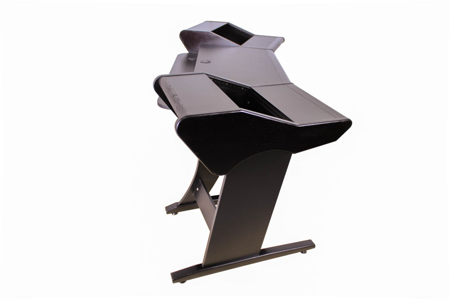 Produkční studiový stůl s rackem pro 12 U 19“, boční části v úhlu, velká ergonomická pracovní plocha, police pro obrazovky a reproboxy. Povrchová úprava černá.
