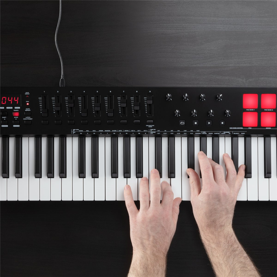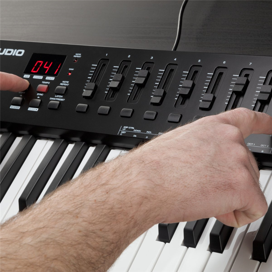 Díky funkcím Smart Chord a Smart Scale lze snadno generovat celé akordy nebo hrát pouze správné tóny v rámci vybrané stupnice. Výkonný arpeggiátor s režimy Latch a Momentary podporuje kreativní rytmické sekvence. Devět faderů a osm otočných ovladačů poskytuje kompletní kontrolu nad mixem a pluginy.