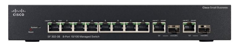 Cisco SF302-08MP, 10portový Cisco switch s možností připojení a napájení až 8 kusů připojených zařízení myMIx přes PoE (Power over Ethernet).