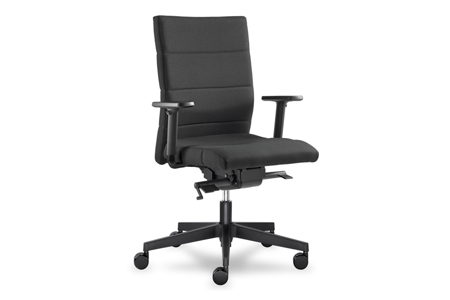 Pohodlná otočná židle pro dlouhé sedění určená do studia nebo multimediálních pracovních stanic. Polstrovaný prošívaný posuvný sedák, polstrovaný prošívaný výškově stavitelný opěrák s nastavením tuhosti, výškově, šířkově i hloubkově stavitelné područky.
