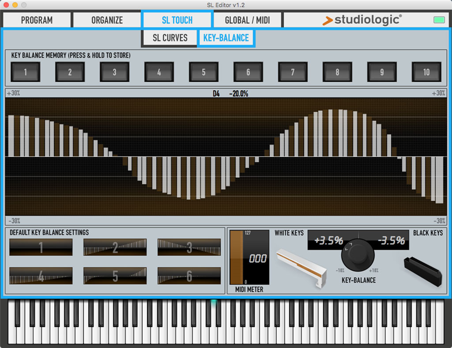 Díky výkonné a jedinečné funkci Key-Balance můžete změnit odezvu každé klávesy, vykreslit nové křivky vyvážení nebo vyvážit poměr mezi černými a bílými klávesy s jediným ovládačem pomocí vizuální zpětné vazby MIDI Meter. Přetáhněte jednotlivé klávesy na požadovanou hodnotu na řádku Balance Line. Nebo nakreslete úplně novou křivku přidržením tlačítka při pohybu kurzoru po celé oblasti Balance. Výsledek se ihned projeví i na vašem SL88.