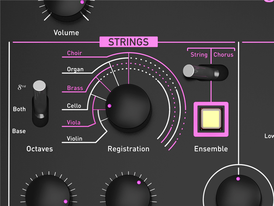 - Plně polyfonní string sekce s presety Viloin, Viola, Cello, Brass, Organ a Choir