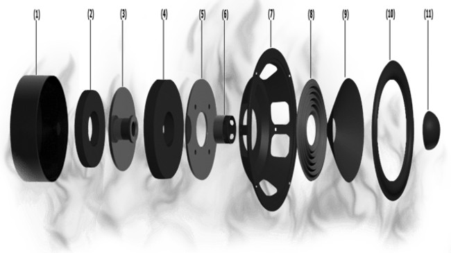 Basový reproduktor má velmi zajímavou konstrukci membrány, která využívá technologií z leteckého průmyslu, kde jsou kladeny požadavky na lehkost a extrémní pevnost materiálů. Výsledkem je patentovaný kompozitní materiál z polypropylenu, uhlíkových vláken a keramiky, který umožňuje velmi rychlou odezvu od nejhlubších basů až po středy.