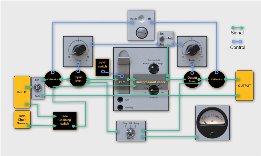 Horní potenciometr U73b přepíná mezi módem komprese (Kompr), bypassu (Durchshalt) a limiteru (Begr). Mód kompresoru má nižší threshold a velmi jemně se zvyšující kompresní poměr. Naproti tomu limiter má vyšší threshold s vyšším kompresním poměrem, ale stále velmi jemný parametr „knee“.