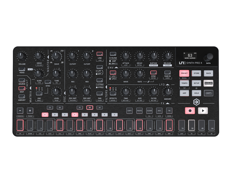 pomocí tlačítek ve spodní části UNO Synth PRO X můžete naprogramovat krokový sekvencer až v 64 krocích. Každý krok může kromě informace o výšce tónu obsahovat i nastavení až 48 parametrů zvuku. Tak můžete step-by-step kreativně měnit i barvu zvuku, nebo krokový sekvencer využít "pouze" k rytmizování některých parametrů zvuku (VCF, VCA, Efektů…), aniž byste měnili výšku tónu. Vaší kreativitě se meze nekladou.